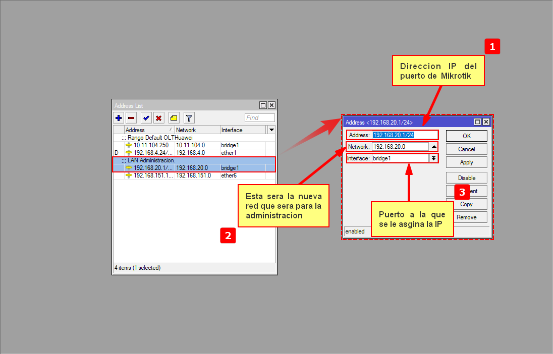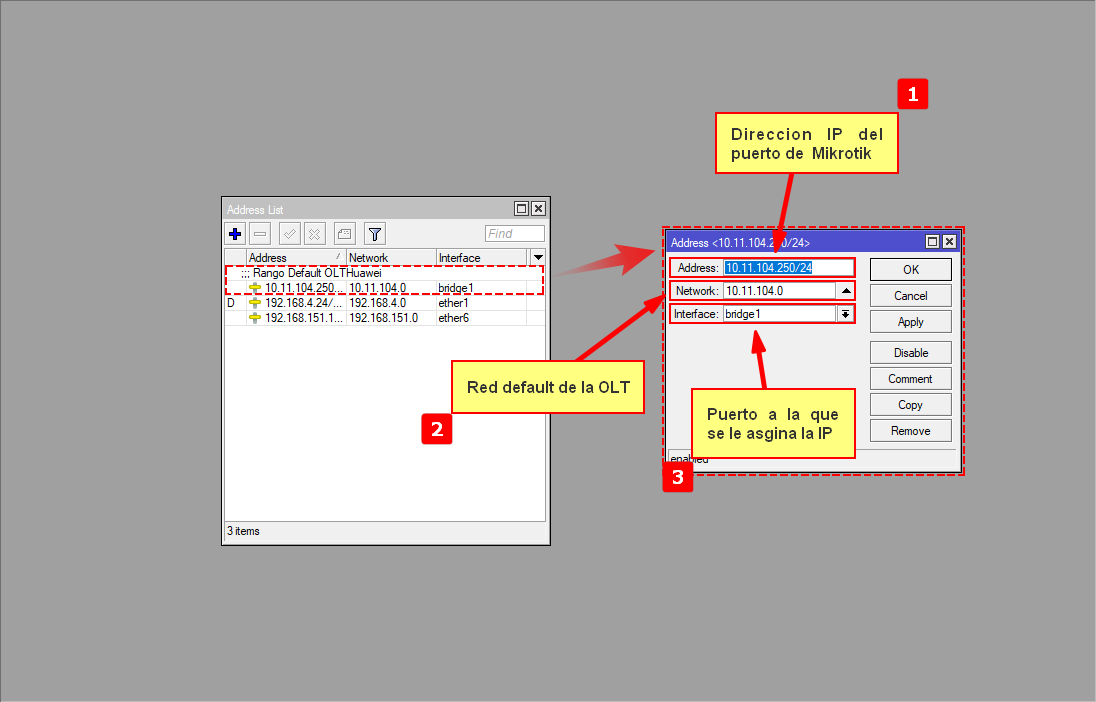 - 1.- Agregamos el segmento default de la OLT: 10.11.104.0/24 para que el mikrotik tenga comunicacion con la OLT