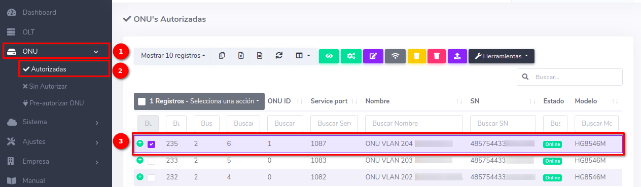 1Dirijase a la sección de ONU > Autorizadas y seleccione la ONU con la que desea trabajar.