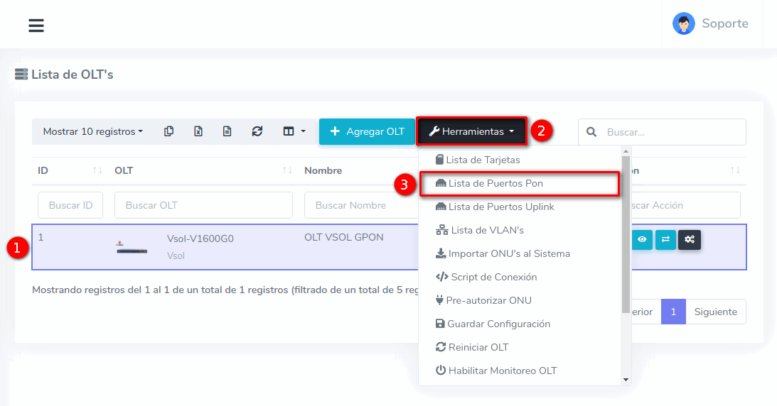 1 Ir a Lista de Puertos PON de nuestra OLT