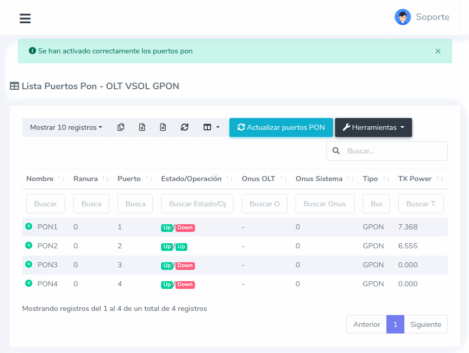 3 Una vez que se termine el proceso podremos ver en la vista la lista de puertos disponibles en nuestra OLT.