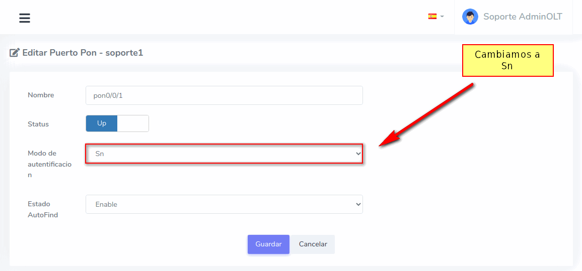 La opción Activar Autofind activa que en todos los puertos sea posible visualizar las onus que están listas para autorizarlas en la OLT. Si no se activa, puede que la OLT no le muestre la información de la ONUs para autorizar en AdminOLT, en la Interfaz de la OLT y al ingresar a la OLT por el protocolo Telnet.