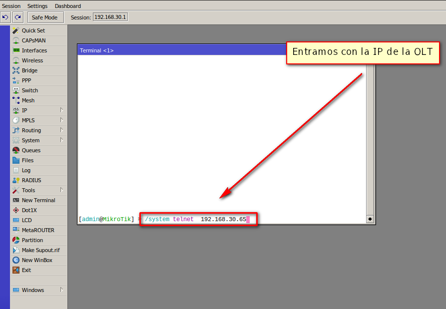1 Entramos telnet a nuestra OLT desde nuestro Mikrotik