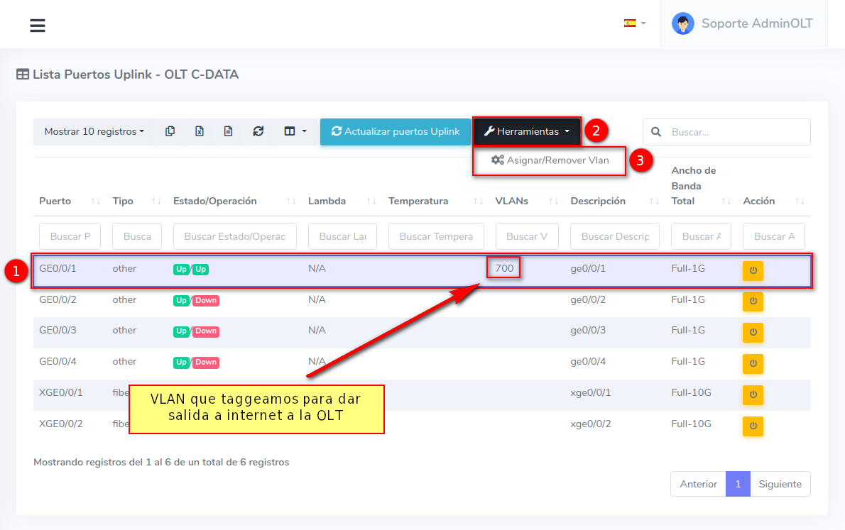 1 En la Lista OLT's seleccionamos el equipo con el que trabajaremos para después ir a Puertos Uplink, que se encuentra en el botón con la leyenda Herramientas.