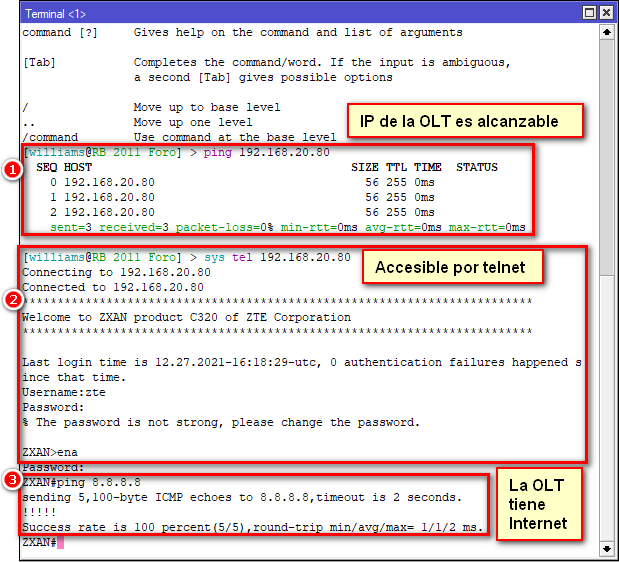 Desde su Mikrotik debe de poder acceder a la OLT, puede probar en la Terminal del Mikrotik haciendo un ping hacia la ip de gestión de la OLT. Si el ping es exitoso debe poder acceder a la OLT por medio de telnet. Por último, si logra acceder a la OLT debe hacer un ping hacia internet, el cual debe ser exitoso.